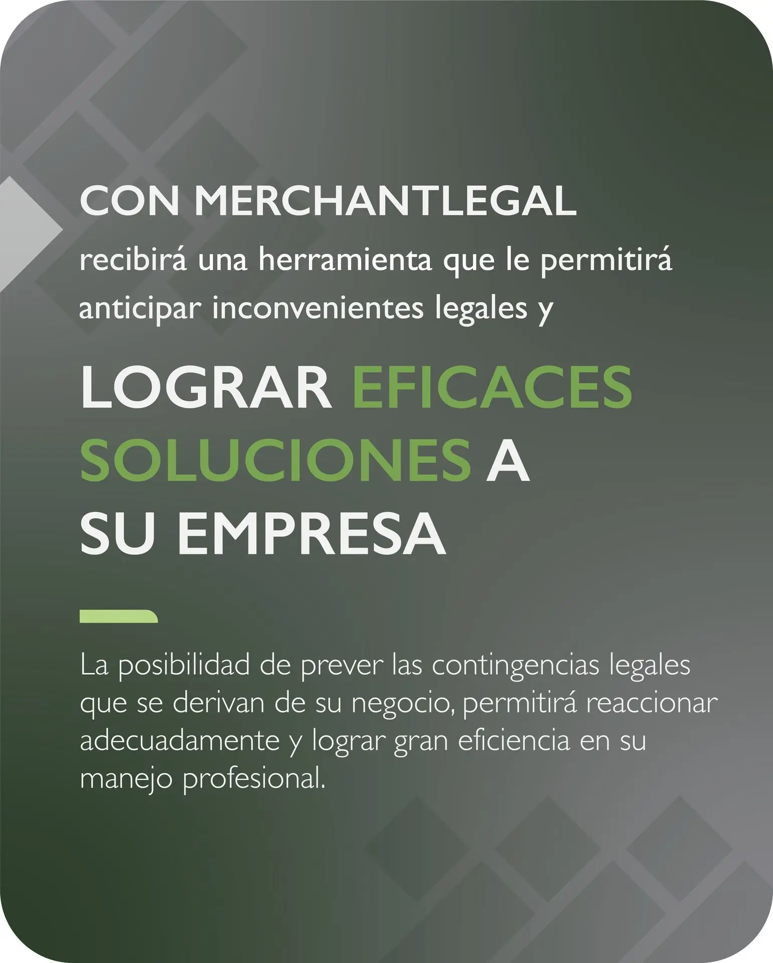 Hemos integrado a nuestra cartera de servicios, la División Legal, que bajo el nombre de MERCHANTLEGAL, está integrada por profesionales especialistas cada uno en su rama de reconocida experiencia.